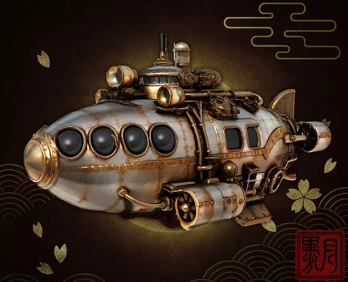 A highly detailed 3D model of a steampunk-inspired submarine, blending retro-futuristic engineering with heavy industrial craftsmanship.Designed as a deep-sea exploration vessel from an alternate industrial age, this submarine embodies the aesthetic of brass, iron, steam power, and exposed mechanics.