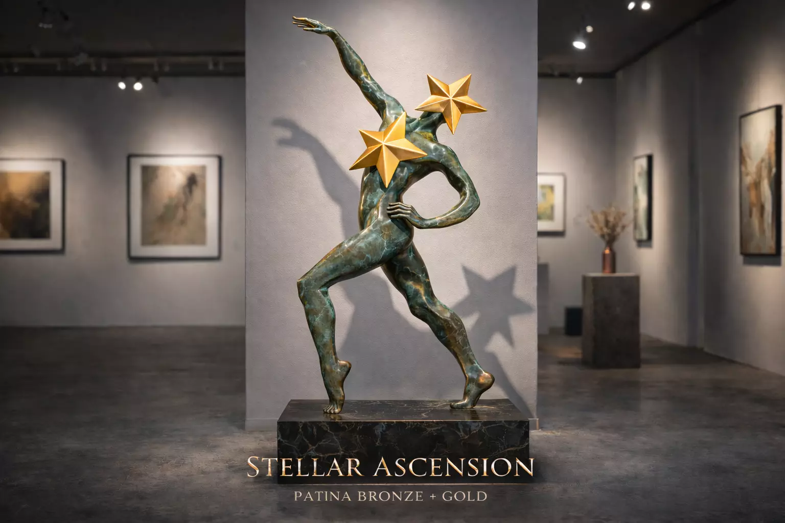 Stellar Ascension is a contemporary abstract sculpture that merges the elegance of the human form with sharp geometric star elements. Designed with dynamic movement and expressive posture, this modern decorative figure creates a striking focal point for luxury interiors, galleries, and architectural spaces.