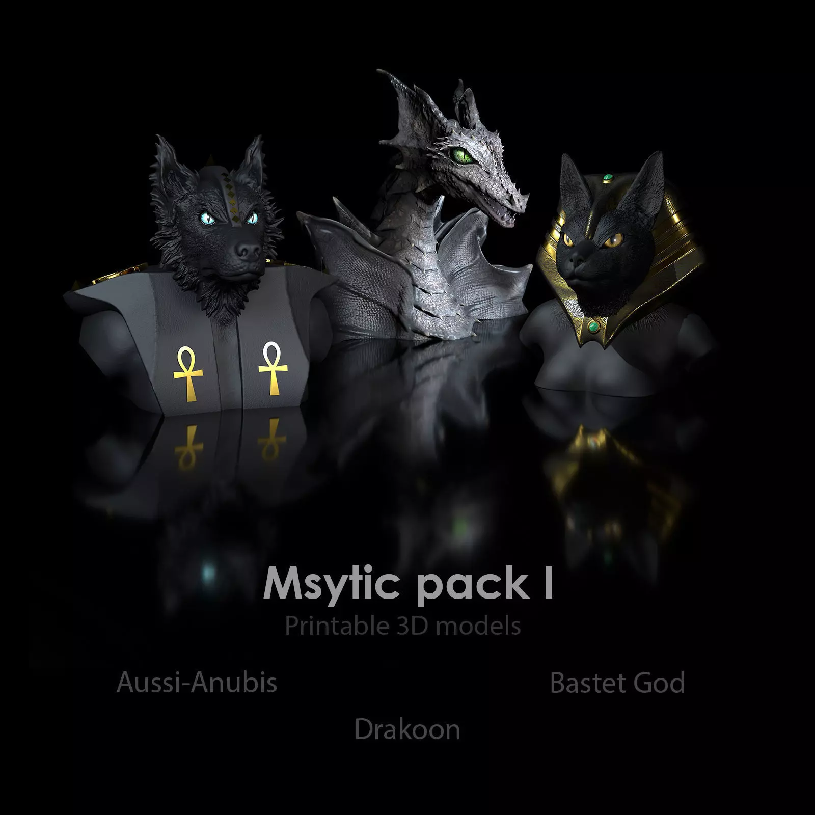 A 30% discount is available for these 3 STL files.3D Print File- Three Mystic Pack IAustralia-Shepard (eangry looking), Draakon, Bastet - bustshigh polygon