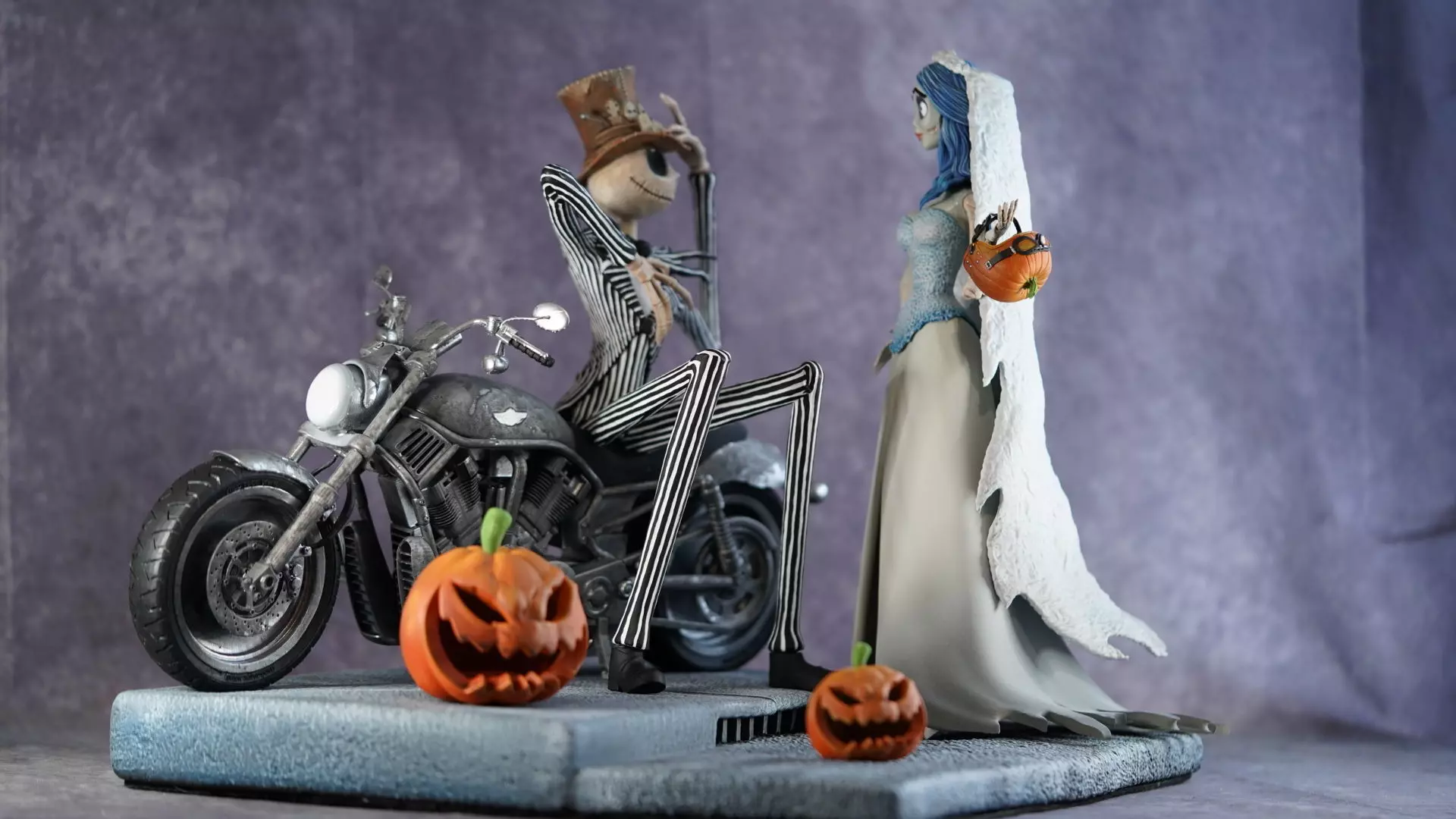 Diorama Halloween conçu dans l'atelierLa scène Jack et Emily sur Harley est d’abord modélisée en 3D. Chaque élément est ensuite fabriqué en résine dans l’atelier afin de s'assurer que chaque fichier STL soit imprimable. Fichiers Validé et approuvé.