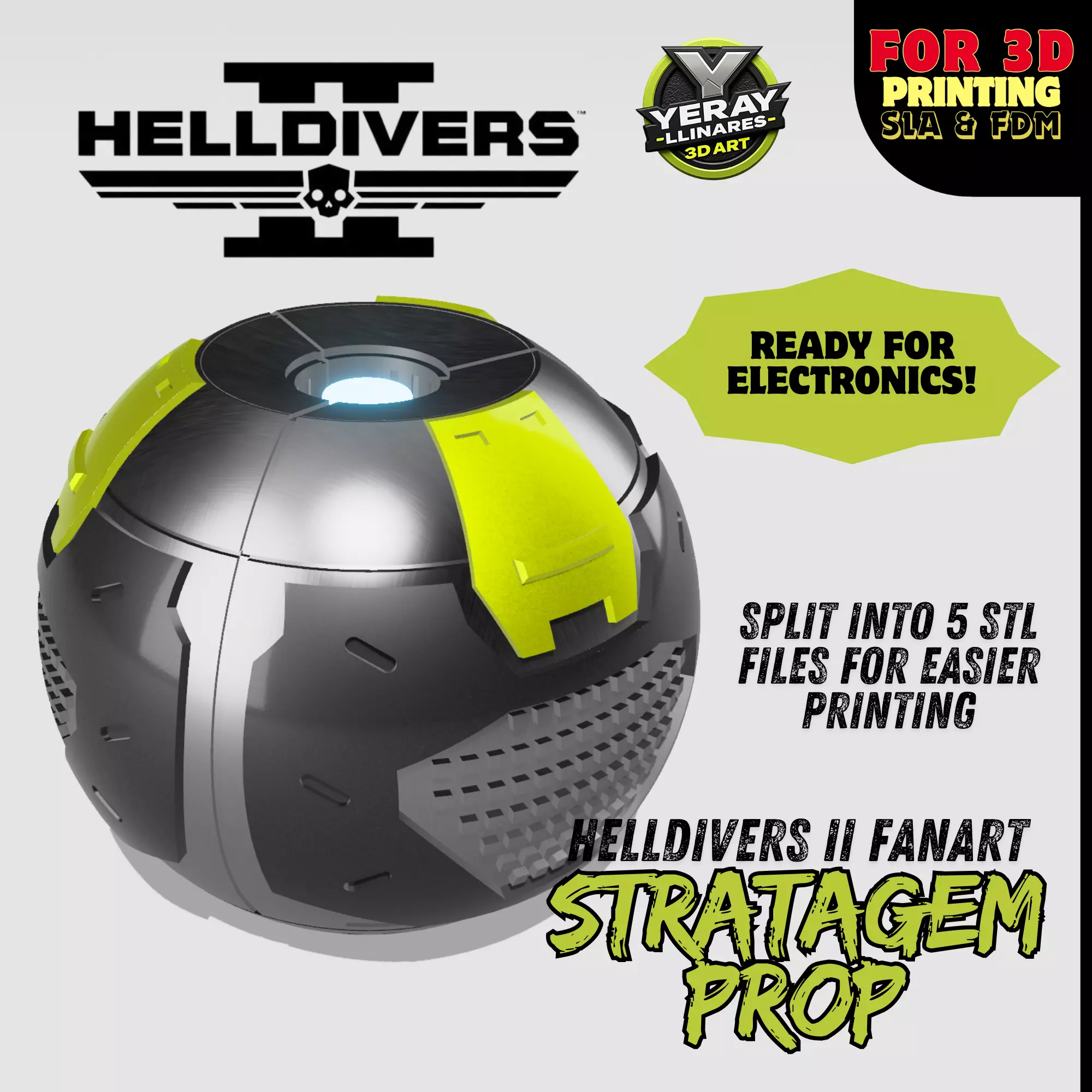 Bring managed democracy to your shelf!This Stratagem Prop is a high-quality fanart replica inspired by Helldivers II, designed for display or cosplay. It’s fully prepared for electronic installation, making it an ideal project for makers who love adding lights and interactivity.