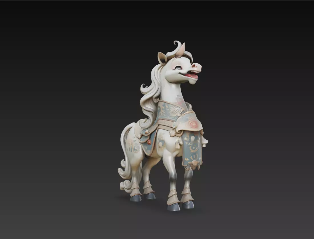 The decorative outfit and soft ornamental details add a unique artistic touch, while the flowing mane and tail enhance the overall silhouette. The slightly raised head and expressive face create a joyful and animated look, making it ideal for character-based projects.