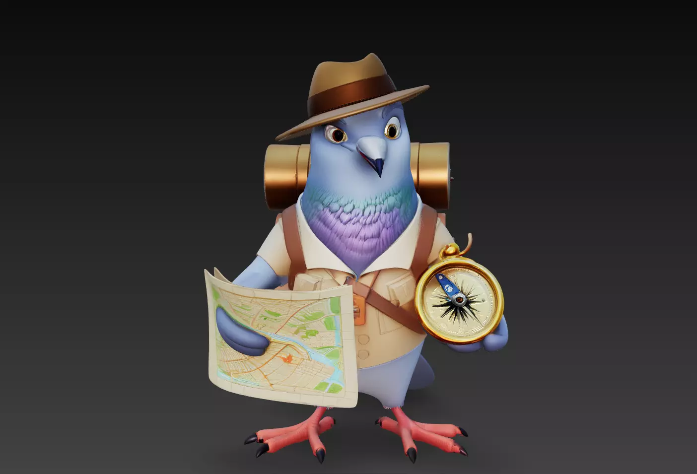 The model features a pigeon equipped as an explorer, wearing a hat and carrying a backpack, map, and compass. These accessories clearly define the character’s role and create a strong narrative focused on exploration and discovery.
