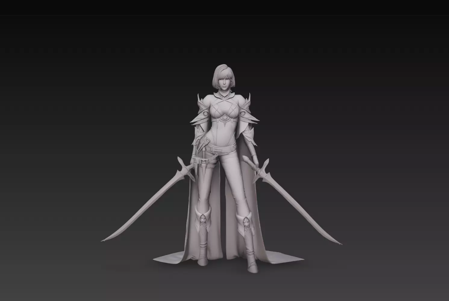 The design focuses on symmetry, sharp silhouettes, and smooth surface transitions, creating a strong and readable character form. The dual swords enhance the visual appeal while maintaining a stable and elegant stance.