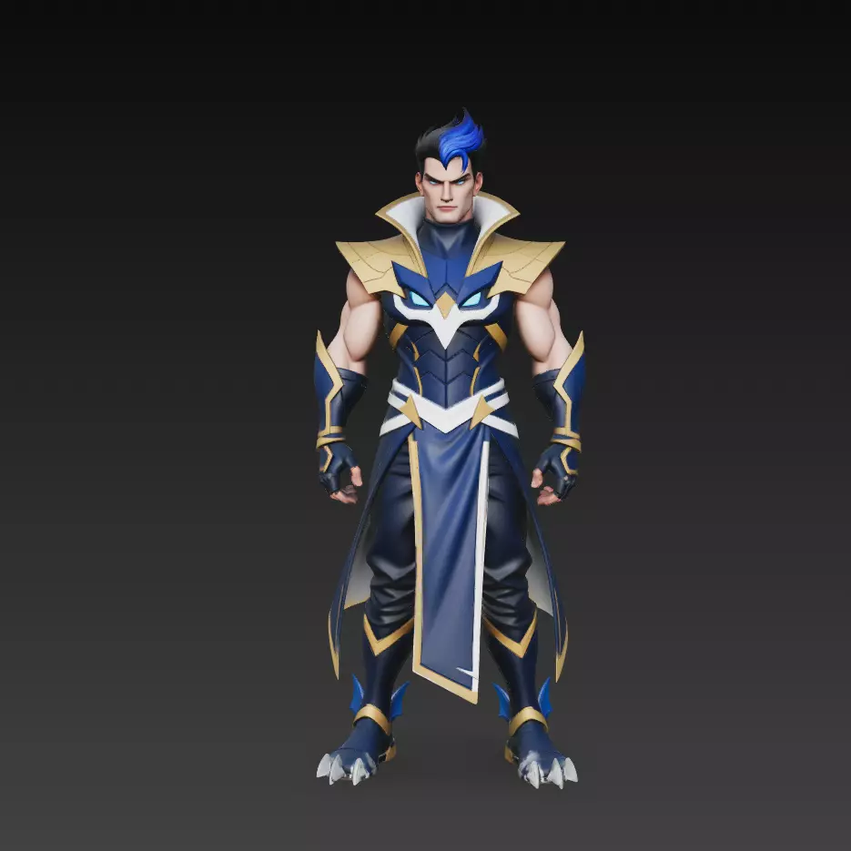 The model includes stylized armor details, a strong silhouette, and a blue-dominant color palette enhanced with gold accents. The design emphasizes a cold and disciplined warrior identity, making it visually distinct and highly appealing.