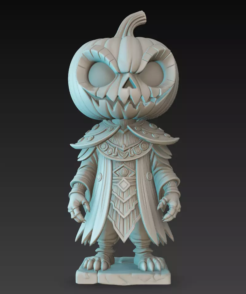 The stylized proportions — big head, compact body, clawed hands and feet — create a collectible toy-like appearance, making it perfect for Halloween décor, fantasy games, stylized animations, or 3D-printable collectible figurines. The carved pumpkin texture, stitched cloak pieces, and geometric armor elements add depth and personality to the character.