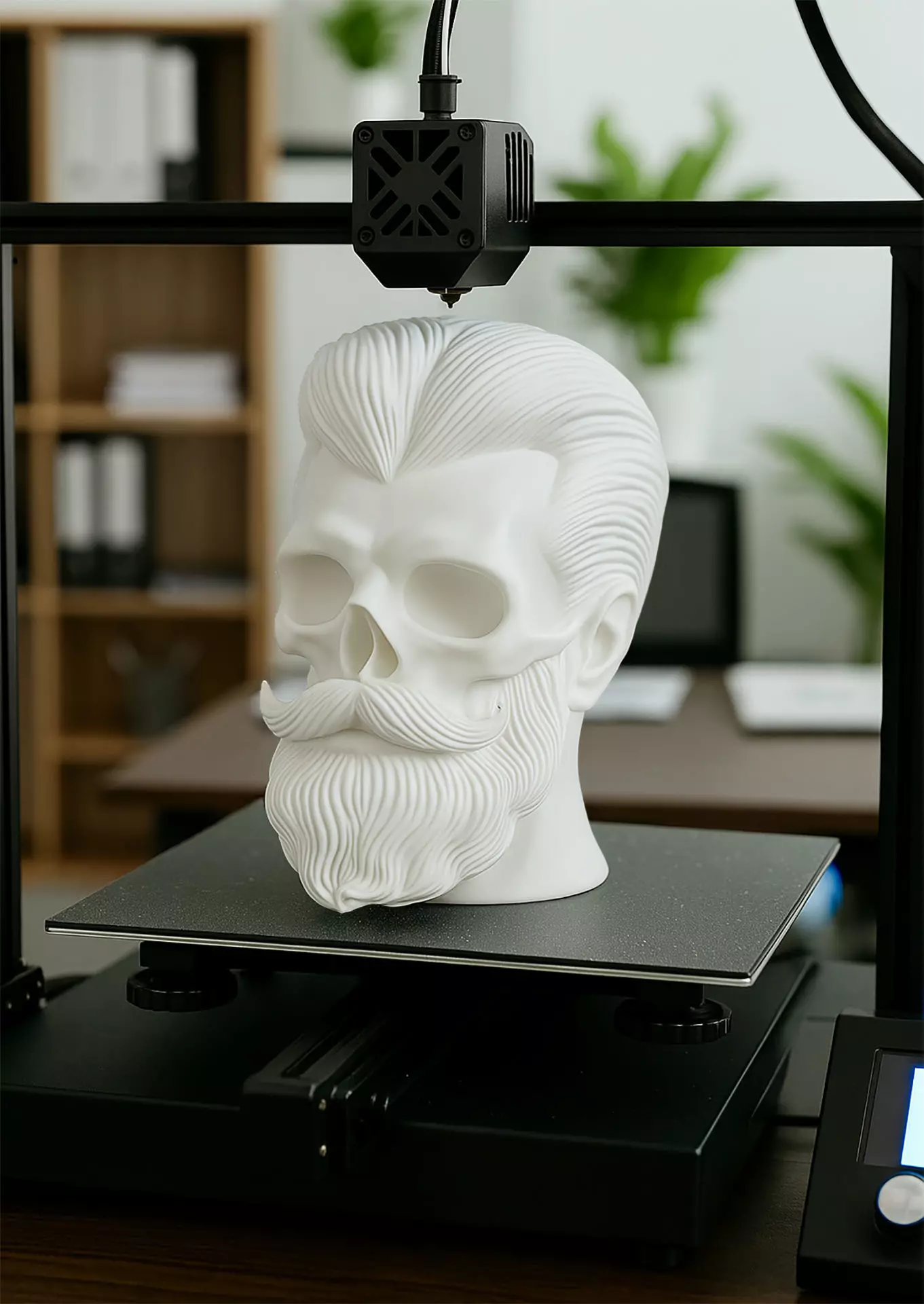 This is a high-quality 3D model of a stylized skull with a beard and hair, perfect for 3D printing, decoration, or use as a digital asset. The model features a modern and stylized design, with attention to detail in the beard, mustache, and hair. It is a high-poly model created through digital sculpting and 3D rendering.