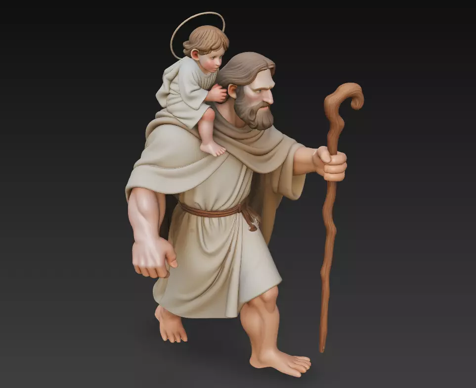 The piece features St. Joseph walking with a shepherd’s staff, while the child Jesus rests on his shoulder, complete with a stylized halo. Ideal for 3D printing, CNC, collectibles, decorative sculpture, and educational or religious art projects.