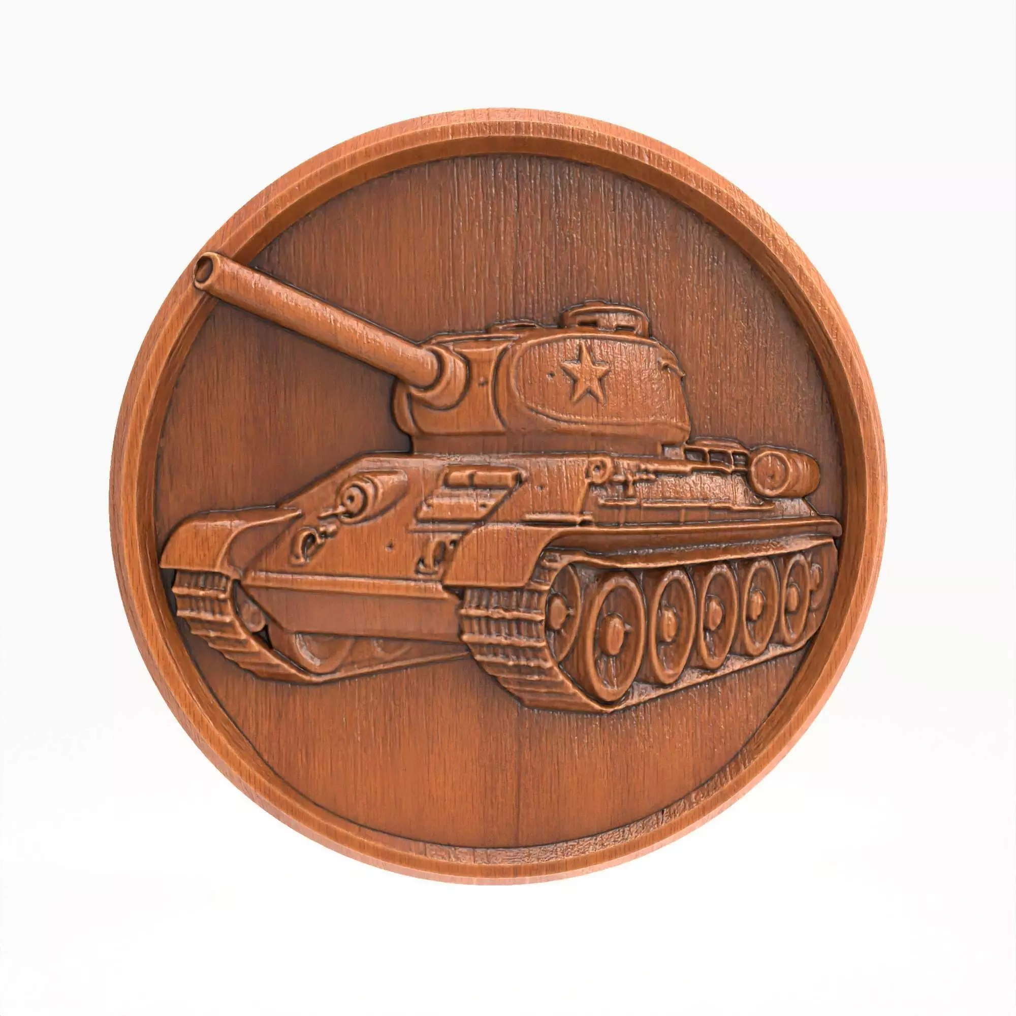 Bold tank profile with turret details and star insigniaBalanced composition in circular plaque formatModeled with relief depth optimized for CNC machining