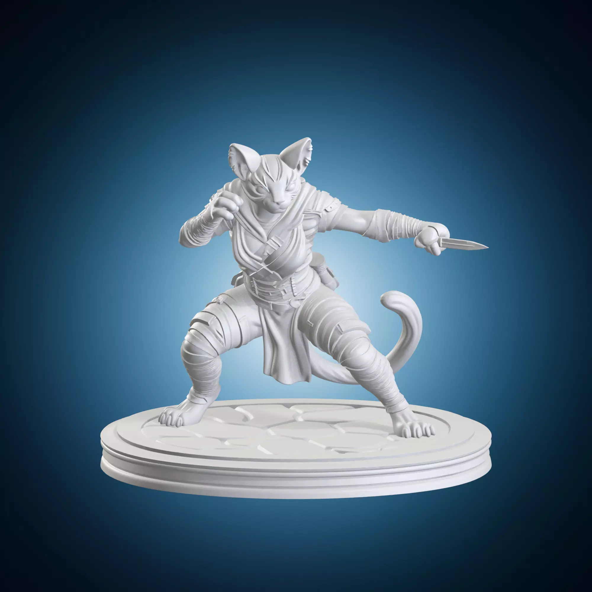 A high-resolution 3D model of a Tabaxi rogue assassin character, perfect for use in video games, animations, or VR experiences. The model features intricate details and textures, capturing the character's feline appearance and stealthy demeanor. With its highly detailed facial structure and agile pose, this model is ideal for creating realistic and immersive scenes. Suitable for use in various applications, including but not limited to: fantasy gaming, animation, and virtual reality projects.