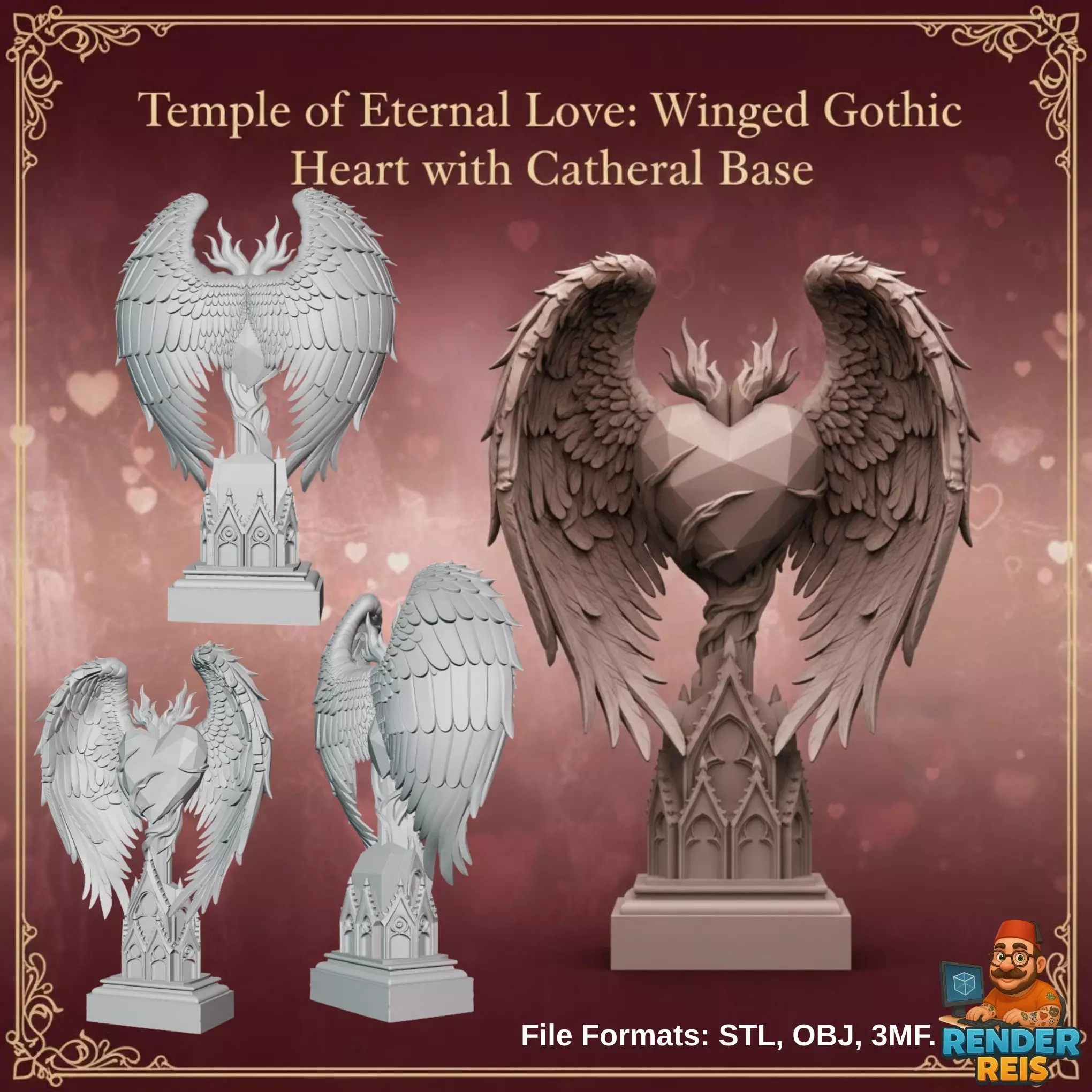 Contact me for custom models and projects.This winged gothic heart sculpture combines the sharp, modern language of low-poly geometry with the highly detailed, spiritual aesthetics of gothic architecture. The faceted heart symbolizes fragile yet eternal love, while the angelic wings and cathedral-inspired base elevate the emotion into something sacred.