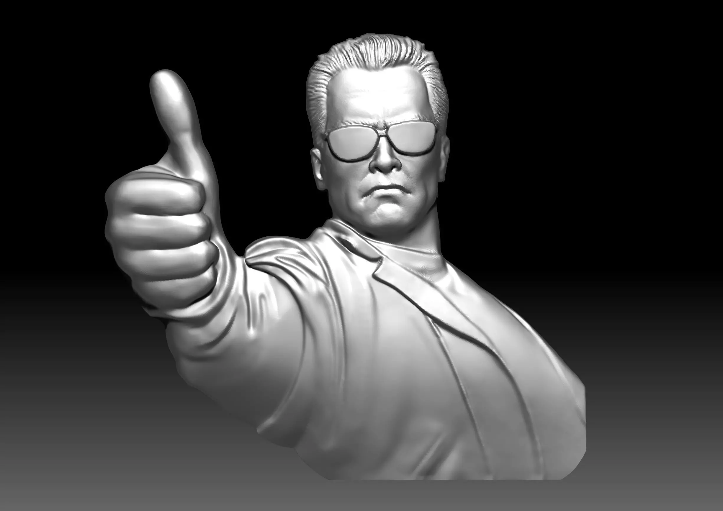 This highly detailed 3D model is inspired by one of the most iconic action characters in pop culture. With a confident facial expression, signature sunglasses, and a bold thumbs-up pose, this sculpture is perfect for collectors, sci-fi fans, and display purposes.