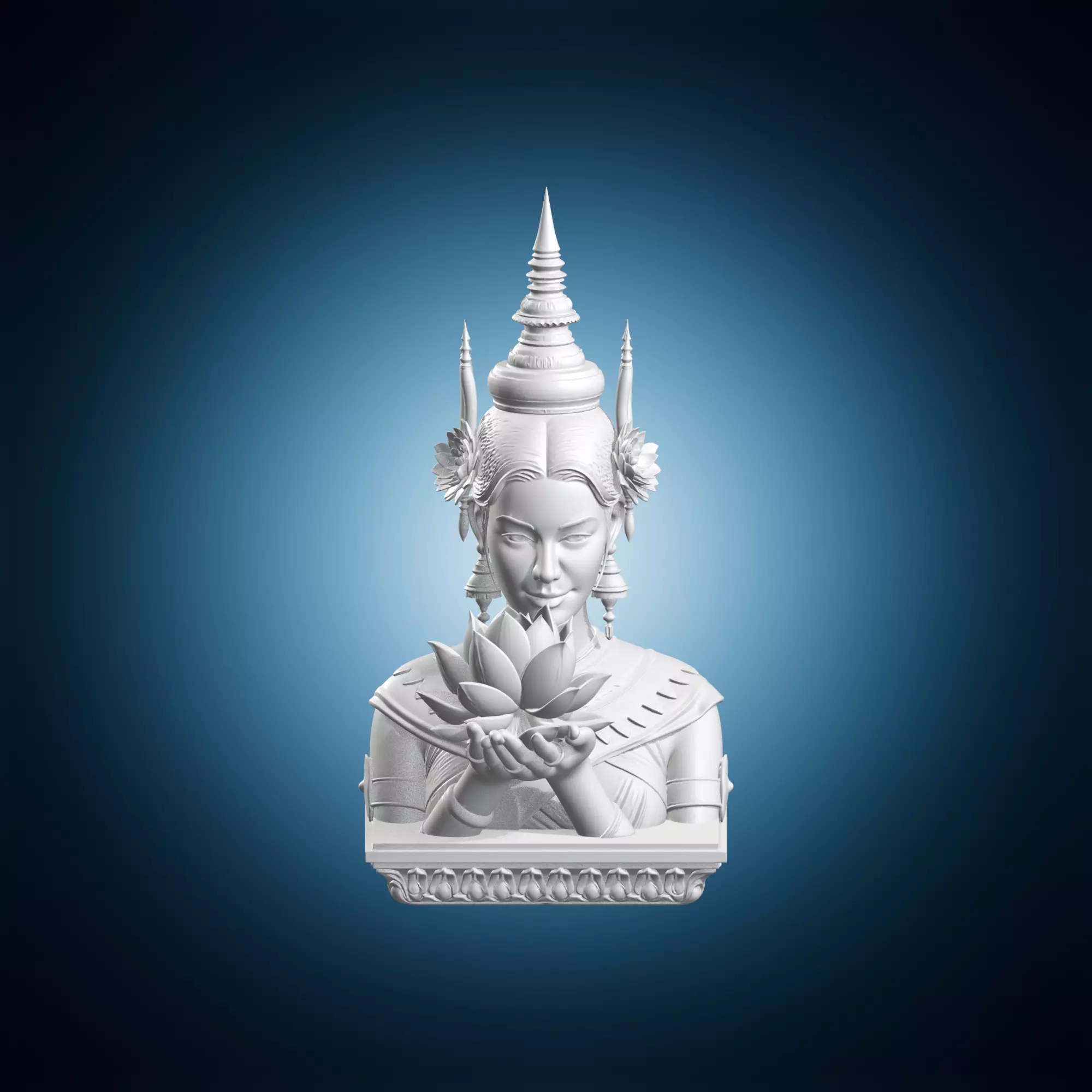 A beautiful 3D model of a Thai woman holding a lotus flower in her hand. The model is posed in a serene and contemplative position, showcasing the intricate details of traditional Thai art. The lotus flower represents spiritual growth and enlightenment in Buddhist culture. This detailed 3D model can be used for various purposes such as animation, video games, or architectural visualization. It is an excellent example of Asian-inspired art and can add a touch of elegance to any project. The model is created with high accuracy and attention to detail, making it suitable for applications where realism is important.