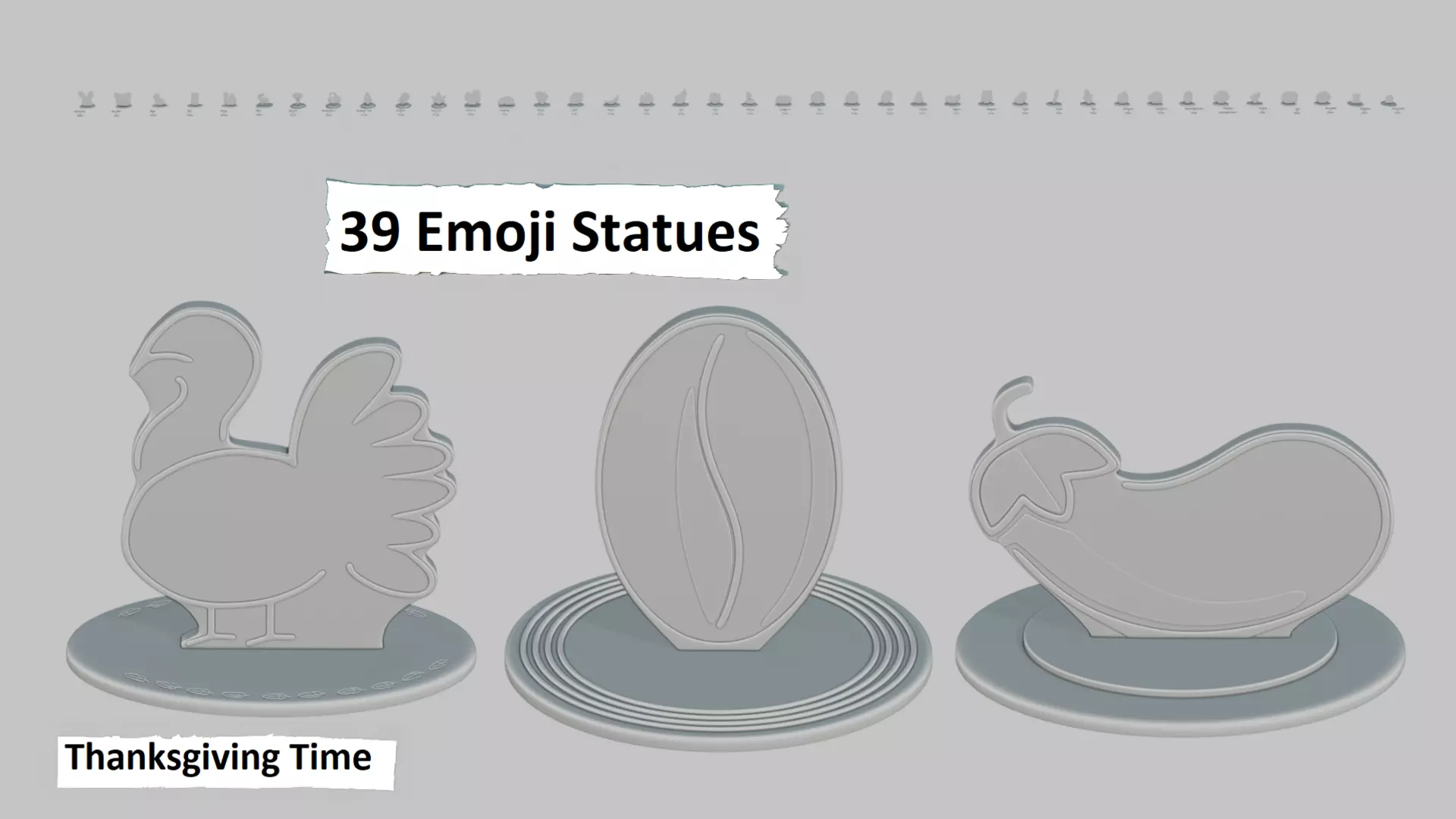 DescriptionA bountiful harvest of emojis turned statues! Perfect for table décor, fall-themed shelves, or stuffing into your 3D-printed cornucopia.