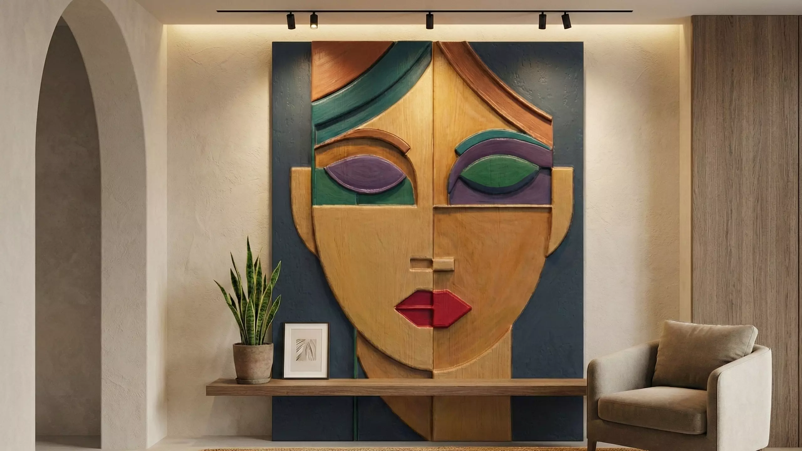 While the geometry itself provides deep, sculptural shadows, this piece is specifically designed to be a canvas for color. The distinct separated zones (eyes, lips, facial planes) make it easy to mask and paint, allowing you to recreate the vibrant stained glass or wood mosaic look shown in the renders.