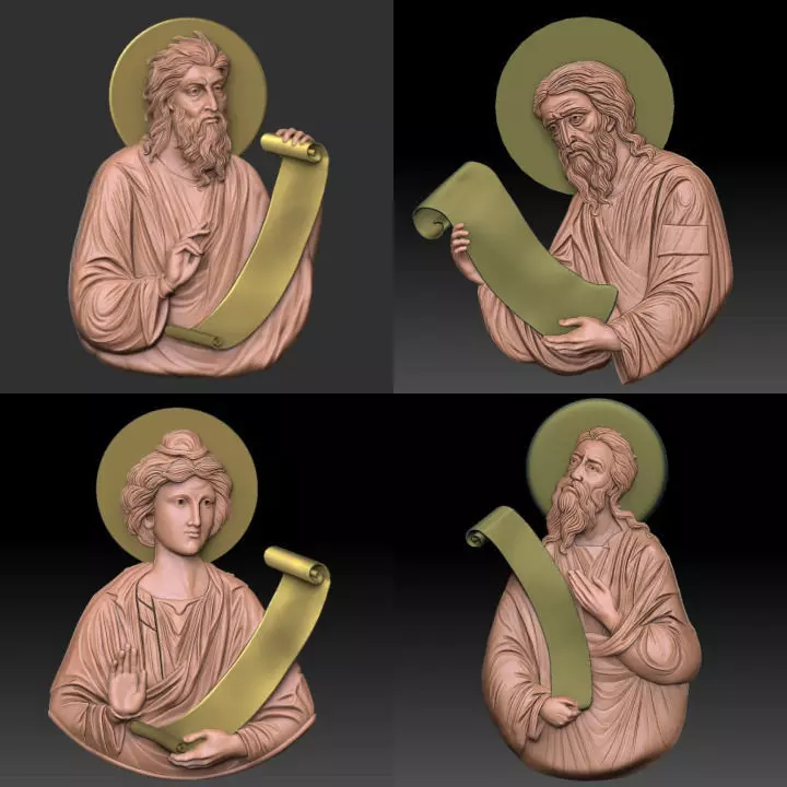 This high-detail Orthodox Christian bas-relief set includes the Four Major Prophets of the Old Testament: Isaiah, Jeremiah, Ezekiel, and Daniel. Designed in traditional Byzantine style, each figure holds a scroll and wears detailed robes, with expressive faces and symbolic gestures.