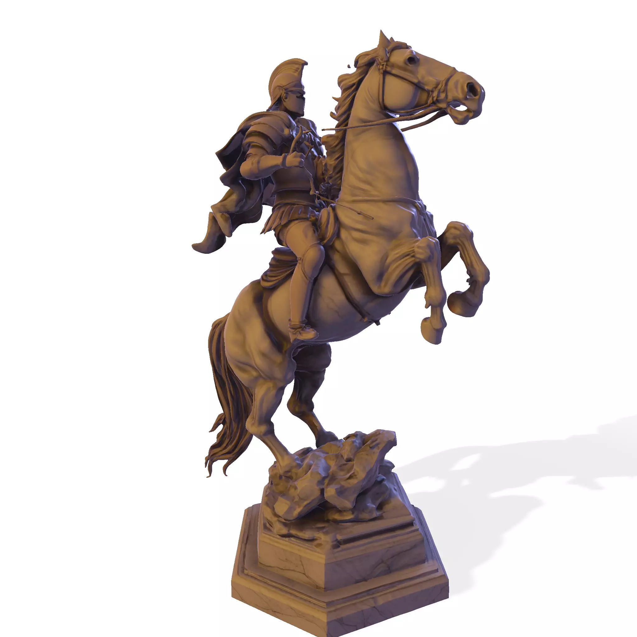 Witness the drama and heroism of a classical battlefield with The General's Charge Equestrian Statue 3D Model. This breathtaking, high-poly sculpture depicts a heavily armored warrior (reminiscent of a Greek or Roman general) mounted on a powerfully rearing horse, poised atop a rugged, rocky pedestal. The model captures exceptional detail in the rider's armor, the horse's musculature and mane, and the dynamic tension of the pose.