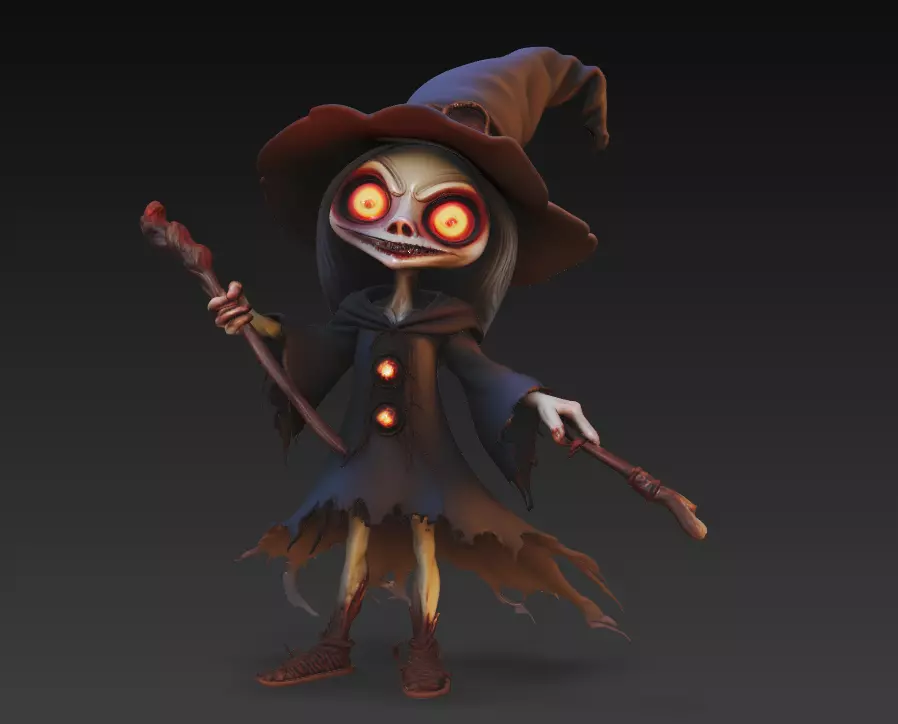 This stylized witch character balances cartoonish charm with gothic elegance —perfect for Halloween displays, stylized render projects, and dark-fantasy collections.