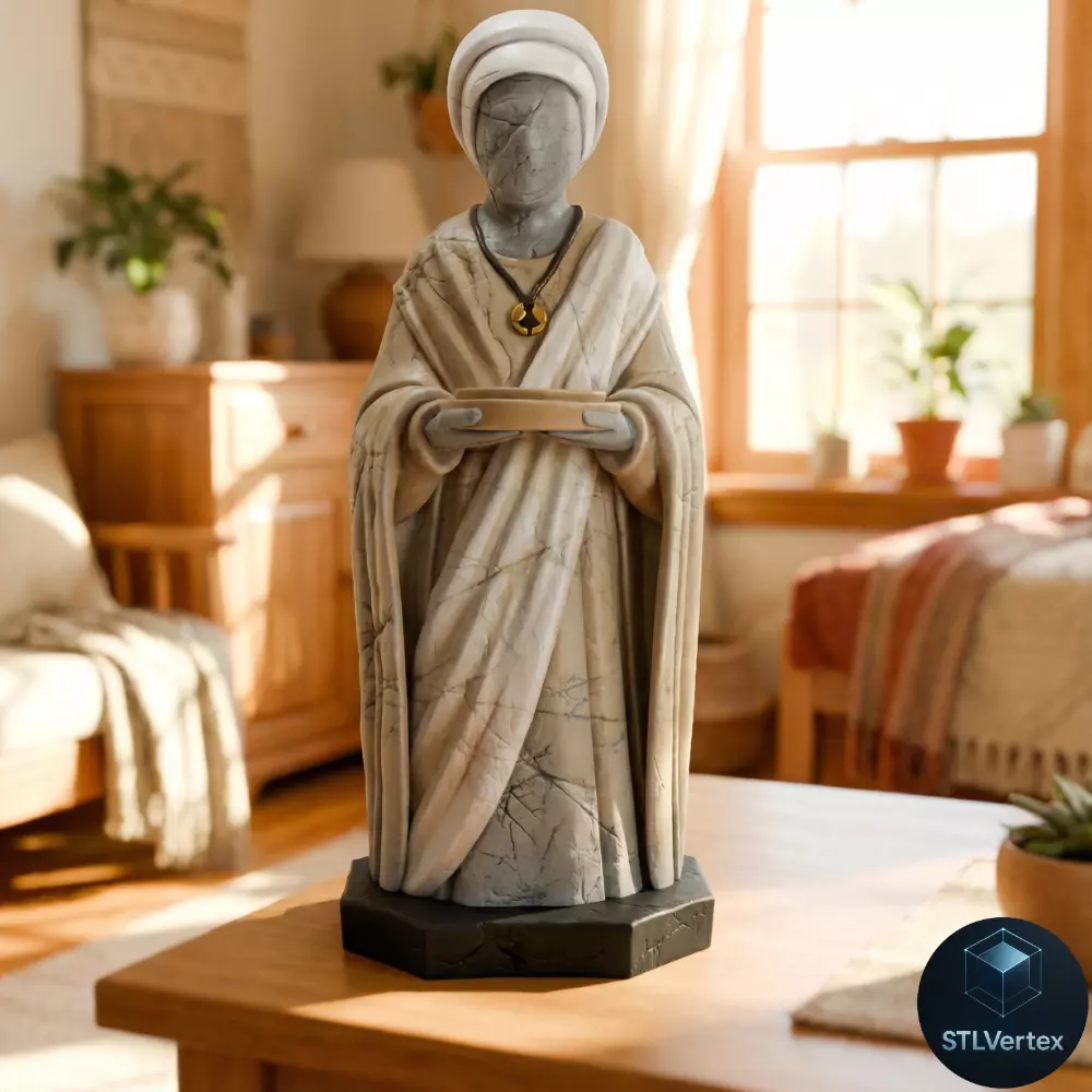 Parámetros de impresión 3DAltura de capa: FDM: 0.12 – 0.16 mm (para preservar el detalle de las grietas) / Resina: 0.04 – 0.05 mm (para máxima suavidad en los pliegues de la túnica).
