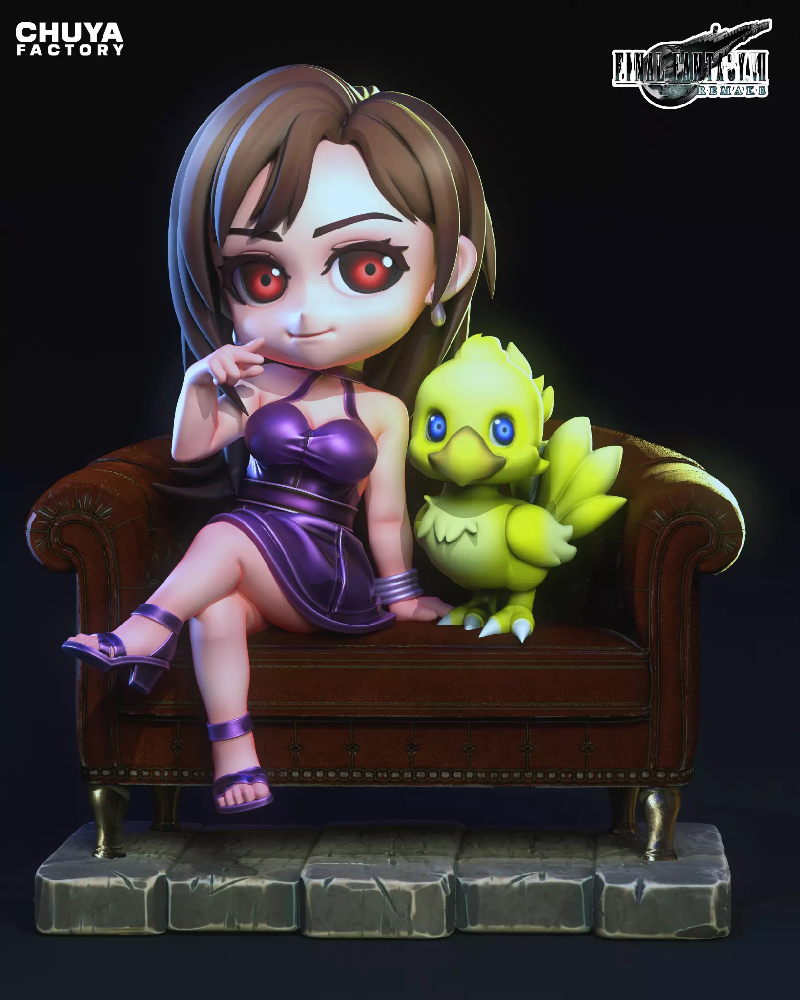 Tifa arrives in an elegant chibi-style collectible, seated gracefully on a plush sofa with her adorable Chocobo companion by her side. Sculpted with soft curves, expressive eyes, and a premium diorama base, she blends charm and sophistication in one display piece.