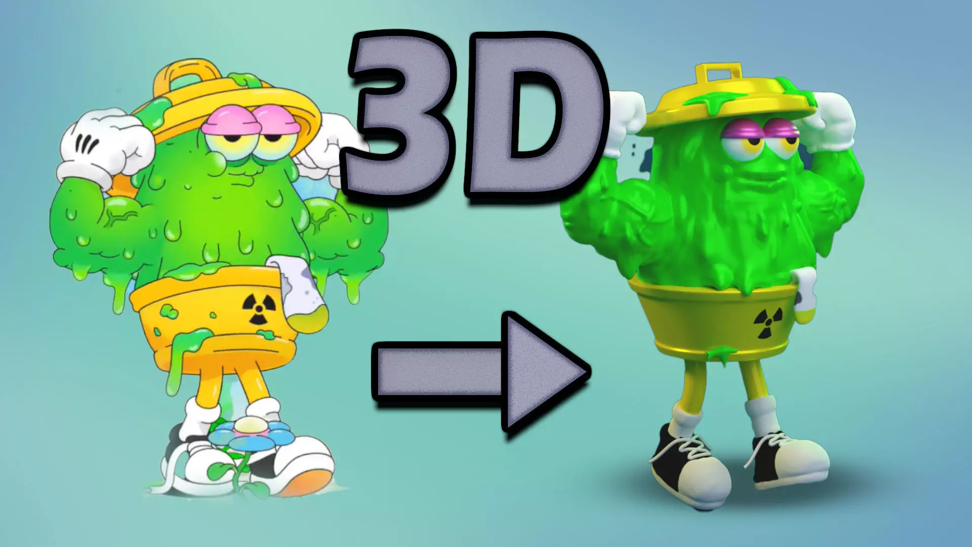 This is a detailed 3D model of a stylized monster character designed specifically for 3D printing. The figure features a vibrant, gooey green creature emerging from a classic yellow trash can, complete with a hazard symbol on its body. The model is complete with fun details like white gloves and black-and-white sneakers.