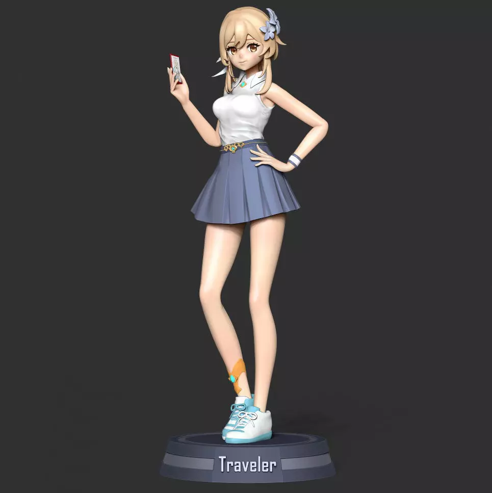 It seems like you're asking for a description of the Traveler character in the game Genshin Impact. As of my last knowledge update in January 2022, the Traveler is the main protagonist of Genshin Impact. Please note that the game may have received updates or changes since then.