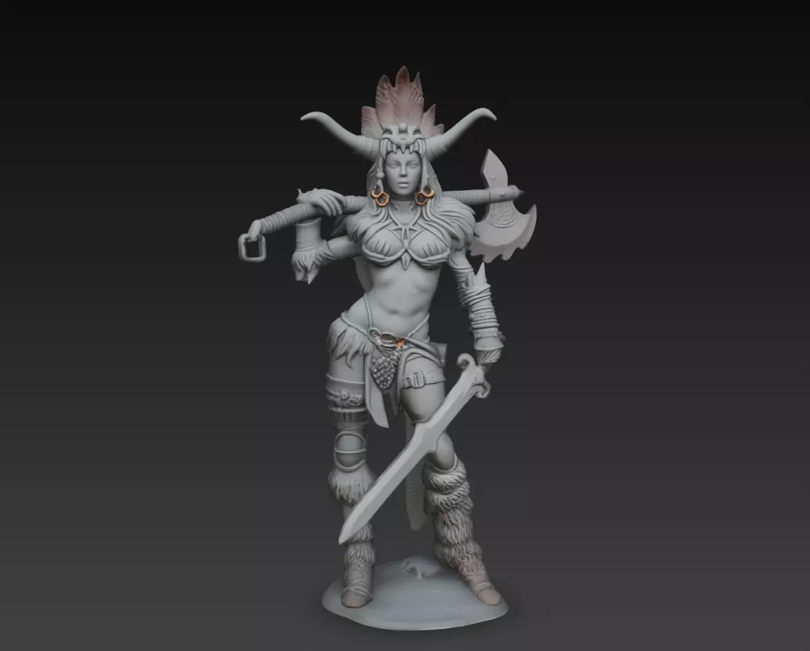 Fantasy characters, barbarian warriors, tribal fighters, female warriors, tabletop miniatures, collectible statues, RPG characters, and 3D printing.
