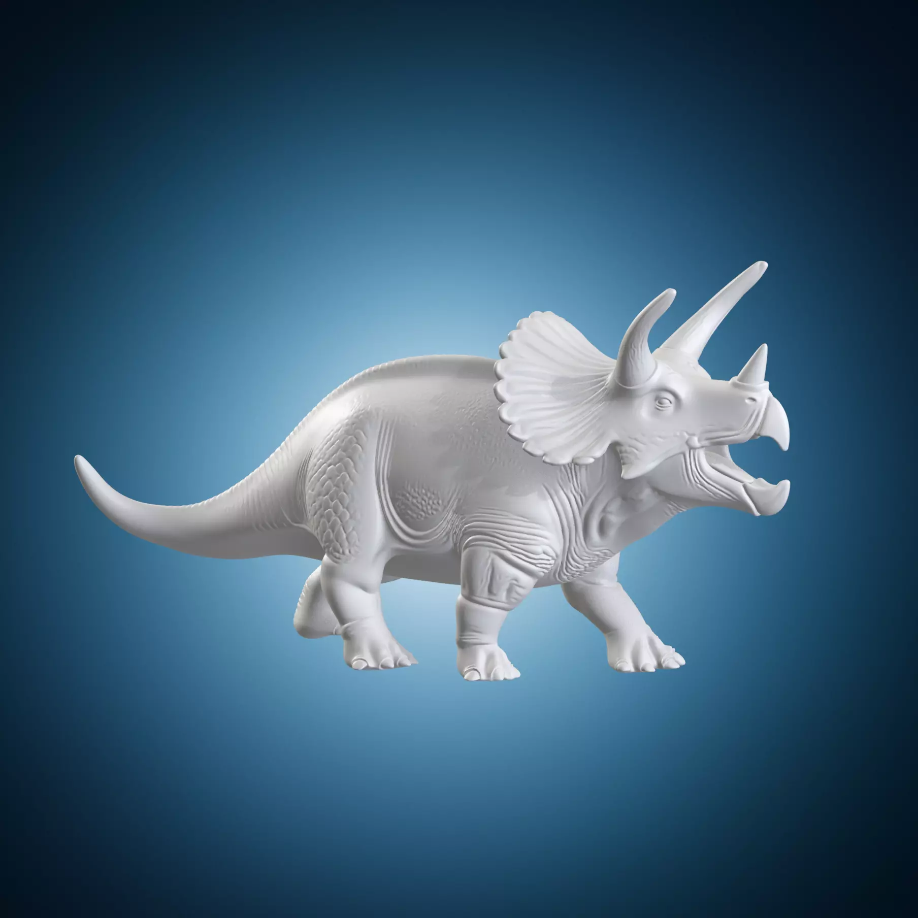 A detailed 3D model of a Triceratops statue standing on a base. This prehistoric dinosaur is depicted in a realistic and lifelike pose, showcasing its distinctive frill and horns. The model is made to be highly detailed and accurate, making it suitable for use in architectural or artistic applications. The Triceratops statue is set against a natural background that adds to the realism of the scene. Suitable for use in 3D modeling software such as Blender or Maya.