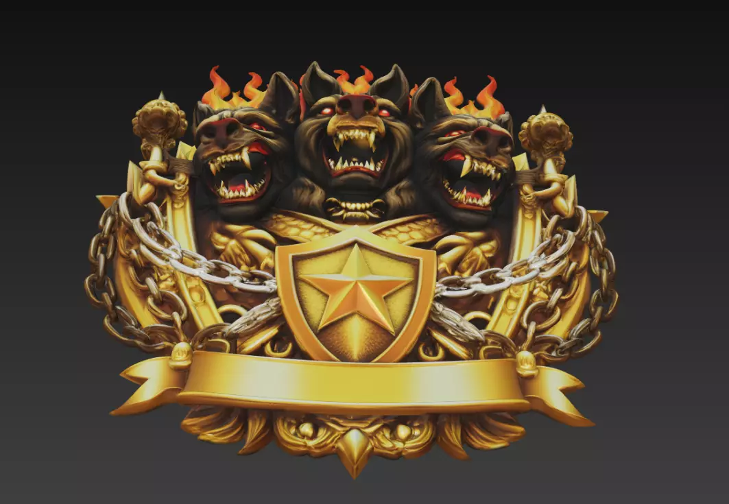 Triple Hellhound Skull Crest With Chains and Flame Shield is a powerful dark fantasy emblem featuring three snarling hellhound heads emerging from flames. The composition is reinforced with heavy chains, spiked armor elements, and a central shield marked by a star symbol, representing dominance, protection, and infernal strength.