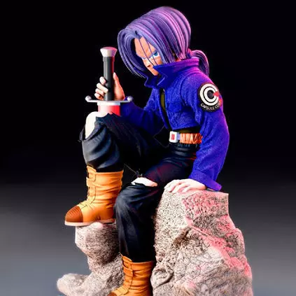 Trunks from the future, as depicted in the Dragon Ball series, is a character known for his distinctive appearance and Saiyan heritage. With lavender-colored hair and a Capsule Corp jacket, Trunks exudes a sense of both strength and technological sophistication. As he sits down, his posture may reflect a combination of determination and weariness, given the challenges he faces in his dystopian future.