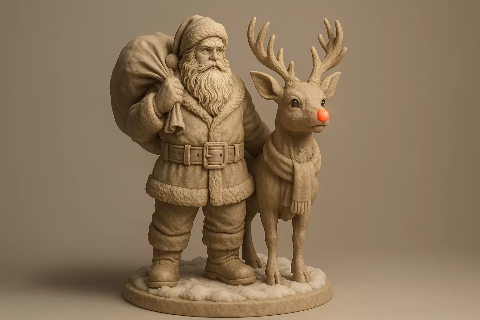 The sculpture sits on a snow-textured circular base, making it perfect as a decorative centerpiece for seasonal displays and holiday decorations.