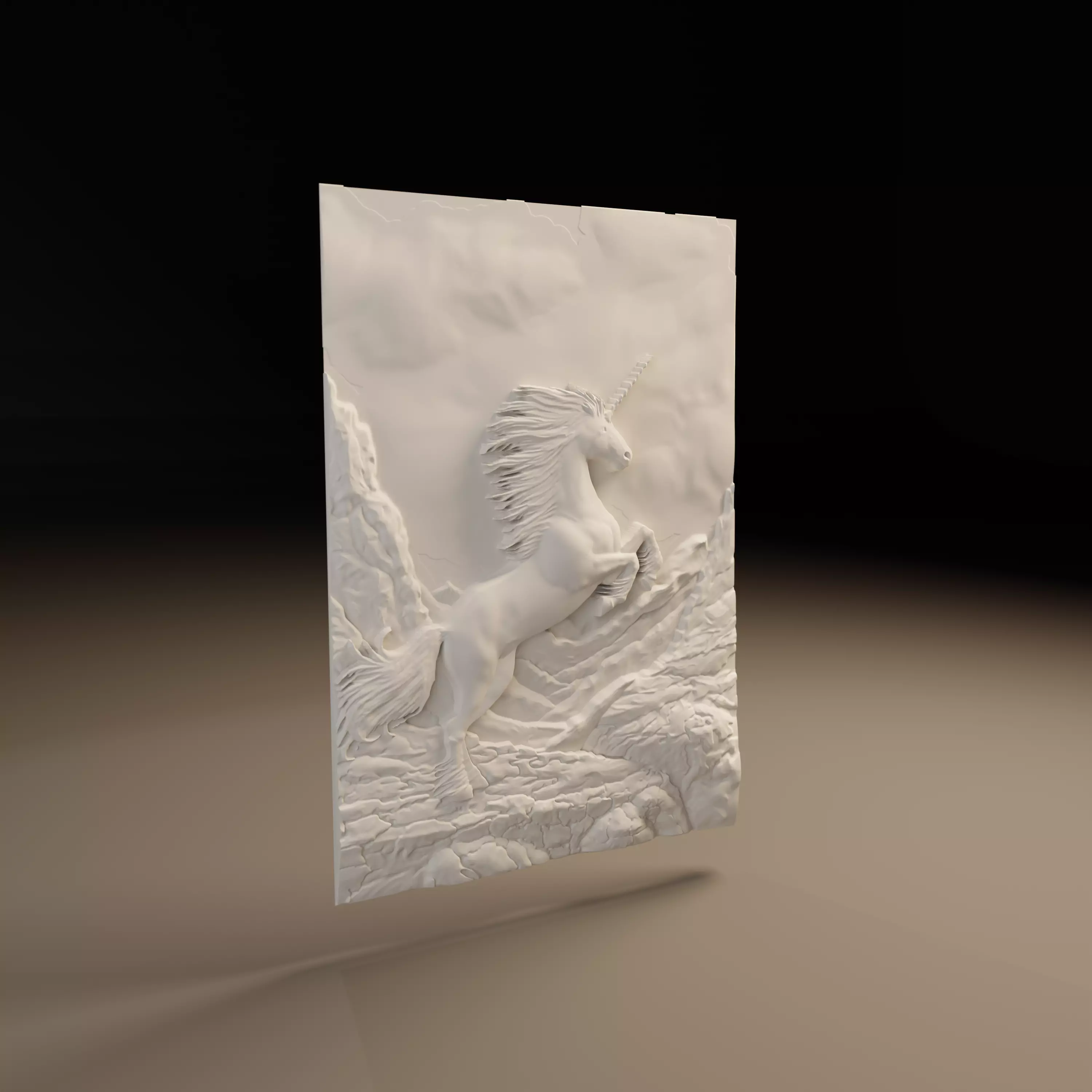 Production ready clean meshOptimized for CNC milling bas reliefHigh detail fantasy compositionDynamic rearing poseEasily adjustable sizeFormats STL OBJ FBX