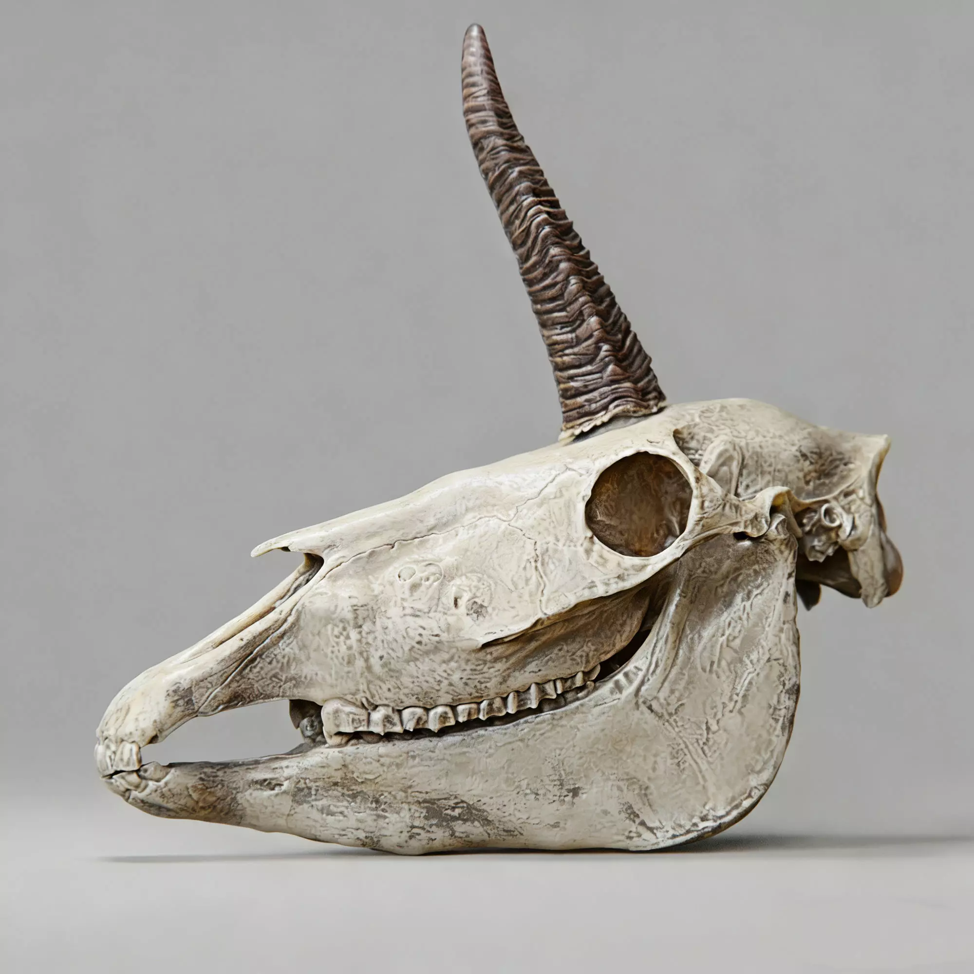 This high-resolution 3D model represents a mythical unicorn skull, carefully designed with a balance of fantasy aesthetics and realistic anatomical structure.The model features a sharply defined cranial form, elongated nasal bones, and a prominent spiral horn integrated seamlessly into the skull, giving it an authentic yet legendary appearance.