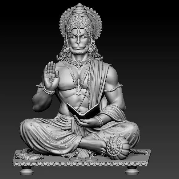 This is a highly detailed 3D sculpt of Lord Hanuman in a calm meditative posture, seated and reading a holy scripture, with one hand in blessing mudra. The design focuses on peaceful expression, strong anatomy, and rich traditional details like mukut, ornaments, and cloth folds.