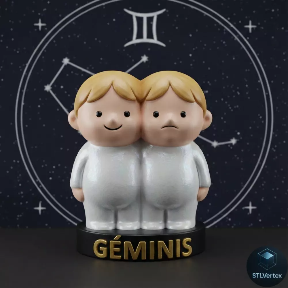 Figura chibi del signo Géminis, representada por dos gemelos unidos de cuerpo completo, uno con expresión sonriente y el otro con gesto serio. El diseño mantiene un acabado liso y uniforme. En la base circular de la figura está escrito en mayúsculas la palabra GÉMINIS. Esta figura fue creada con la intención de convertirse en molde de vela.