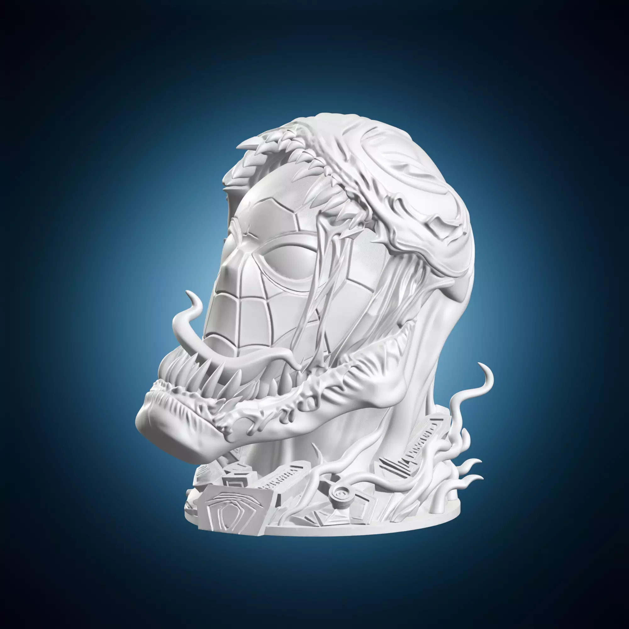 A detailed sculpture of Spiderman's head in a venom-inspired design. Created using artistic skill and attention to detail, this bust is perfect for fans of the Spiderman franchise. The sculpture features intricate details such as texture and shading, making it a unique addition to any collection.