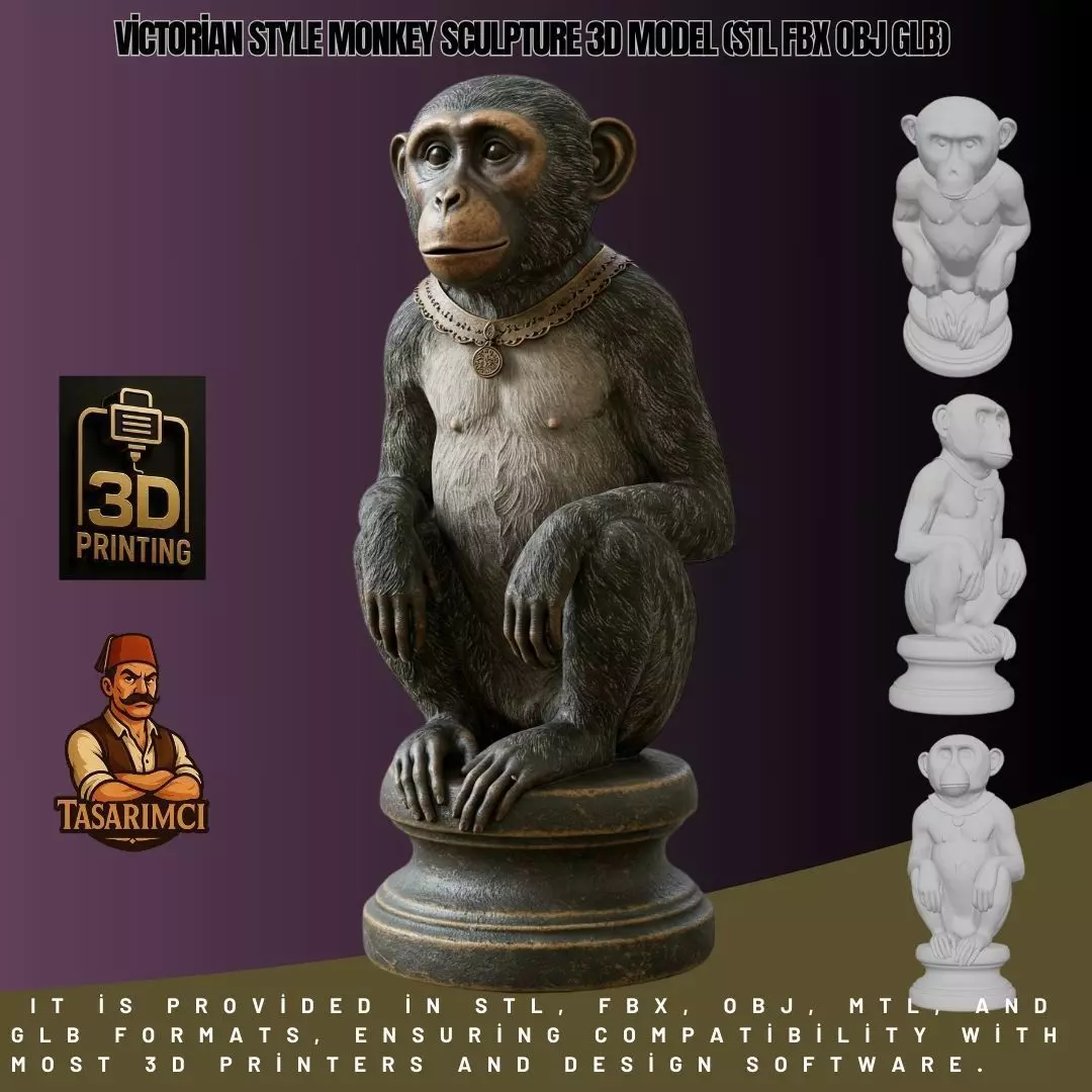 Detailed Description:This 3D model features a monkey sculpture inspired by the Victorian era’s deep curiosity for evolution, exotic animals, and natural history. In the 19th century, monkeys symbolized both scientific intrigue and philosophical reflection, especially in the context of Darwin’s theories. This design merges anatomical realism with ornate historical styling.
