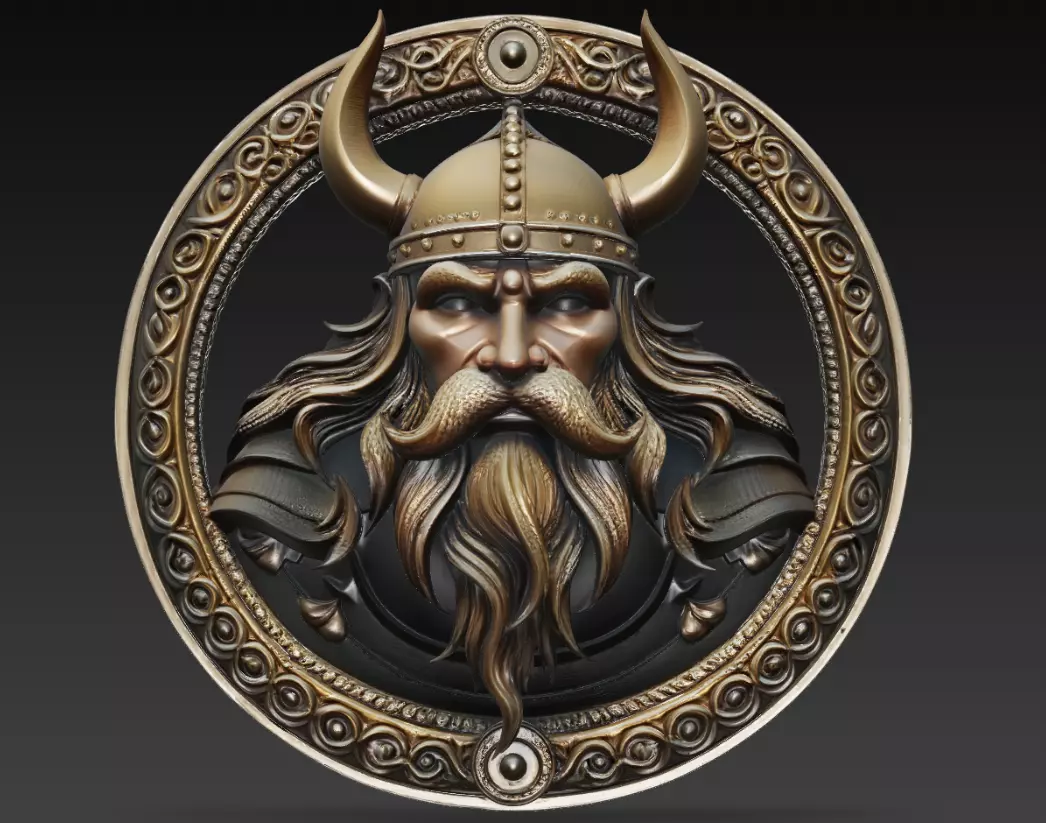 The ornamental circular frame enhances the medallion composition, giving the model the appearance of a collectible Viking coin or ceremonial emblem.