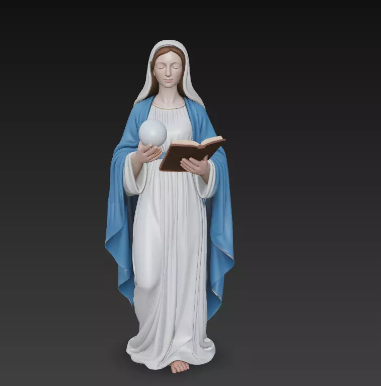 This Virgin Mary Sculpture – Sacred Madonna 3D Model represents a serene and graceful depiction of Mary holding a symbolic orb and an open book. The draped garments, soft facial expression, and gentle pose create a devotional and peaceful atmosphere ideal for religious art.