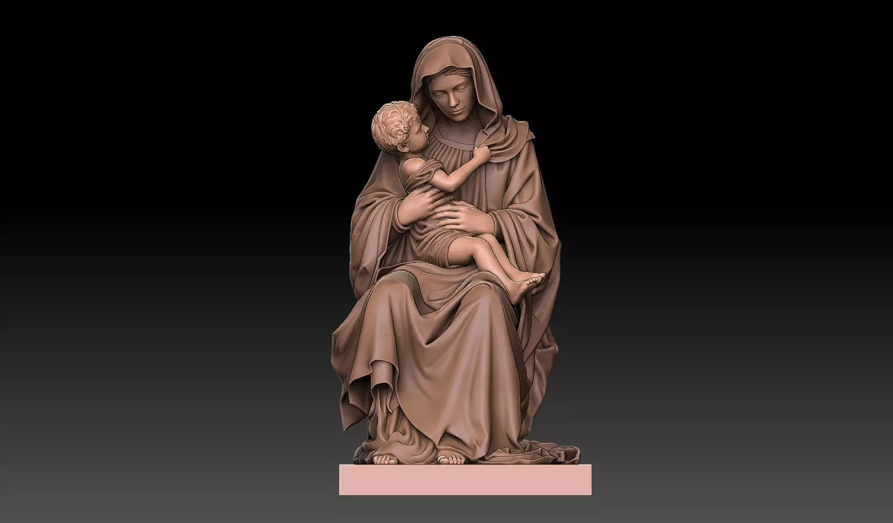 A stunning, fully 3D sculpted statue of the Virgin Mary holding the Child Jesus (Madonna and Child). The composition captures a tender, spiritual moment with exceptional realism. Mary is depicted seated, wearing heavily draped robes that flow naturally, while the Christ Child sits securely in her arms, looking up at her with affection.The model features intricate details in the curly hair of the Child, the serene facial expressions, and the deep, realistic folds of the fabric. It is a masterpiece of digital sculpting, bringing classical religious art to the modern 3D printing era.Technical Specifications: