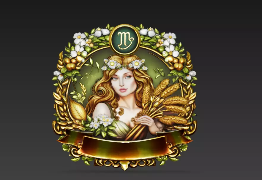 Virgo Zodiac Royal Crest 3D Model features an elegant maiden figure holding wheat sheaves, framed within an ornate golden heraldic structure enriched with flowers, leaves, and harvest-themed decorative elements.