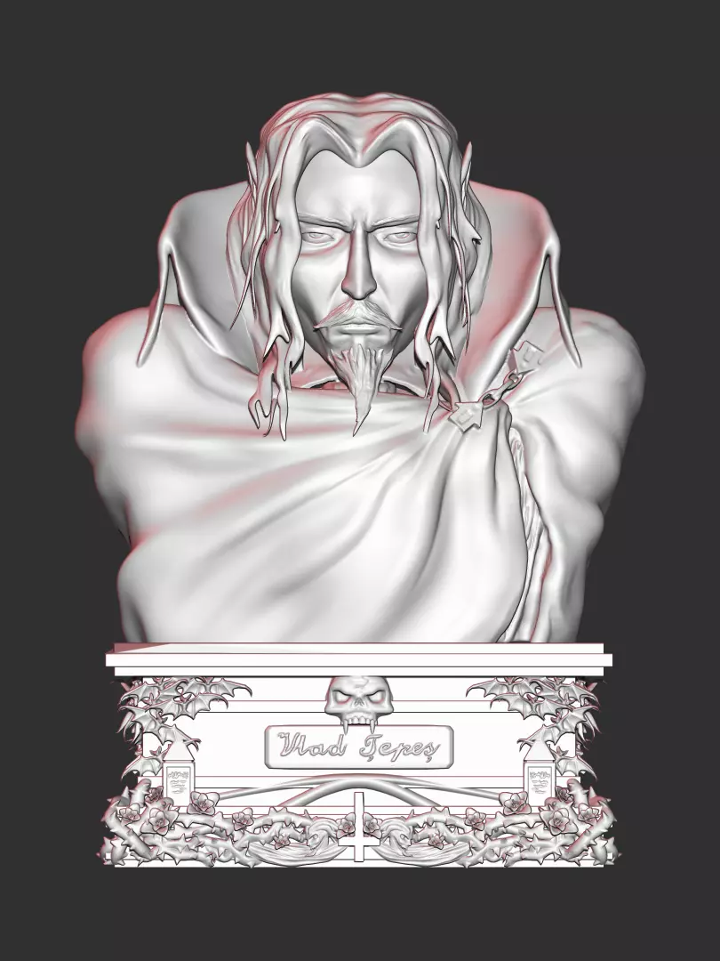 Enjoy this exquisitely detailed, haunting visage of Vlad Tepes from Castlevania - the lord of darkness Dracula. Print him out and paint him up for an eye-catching piece of shelf decor or a desk piece that's sure to keep your co-workers away.