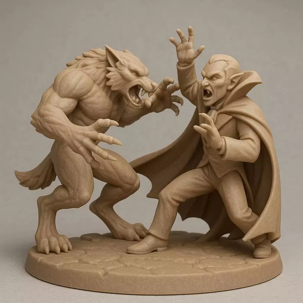 A 3D printable Halloween figurine of a werewolf locked in battle with a vampire, both posed dramatically on a shared circular base. The werewolf is mid-swipe with extended claws, muscular and fur-detailed, while the vampire has a flowing cape and sharp fangs bared, one arm raised in defense. Their stances are intertwined in a dynamic clash, with reinforced contact points between figures and base for durability. The base is textured like rocky ground for stability. Stylized yet simplified for reliable 3D printing, compact, sturdy, and perfect for display or Halloween decoration.