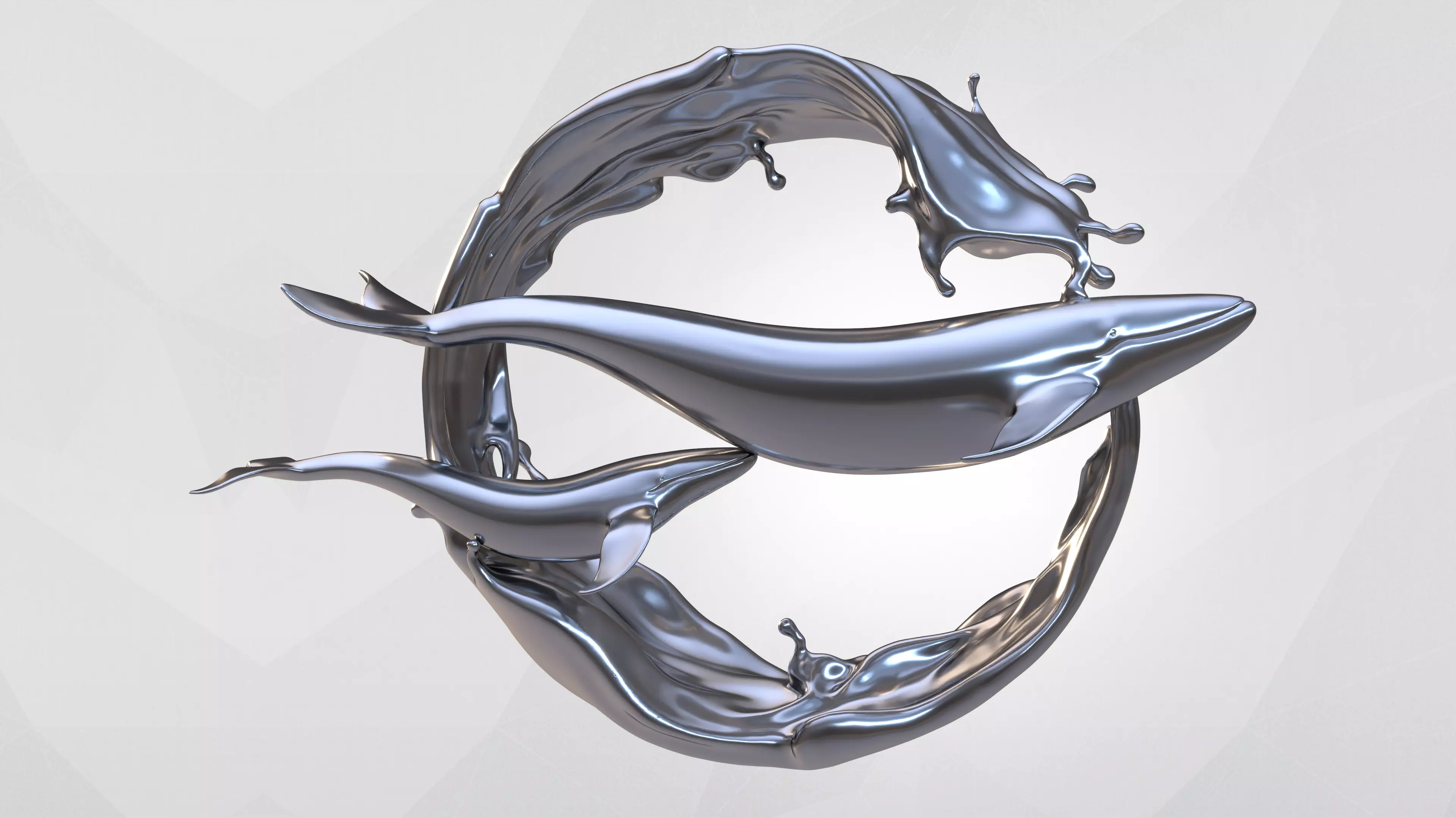The sculpture The Dance of Whales depicts two whales of equal size, spiraling around each other in a circle. The whales' bodies are intertwined, their tails flipping through the air.
