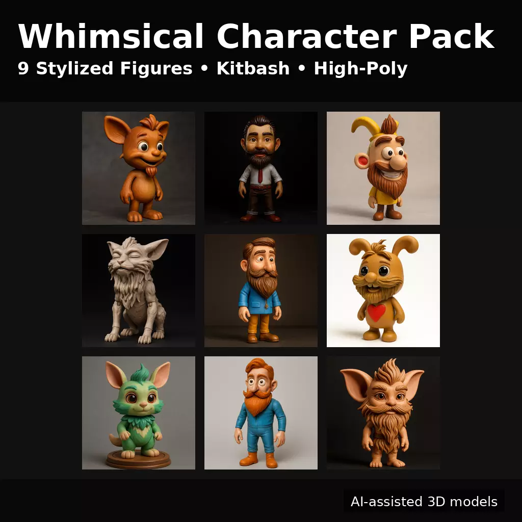 This pack is a Whimsical Character Collection—a set of 9 stylized, high-poly figures designed with a playful “toy/collectible” vibe.Each character has bold silhouettes, exaggerated facial features, and clean stylized details, making them great for: