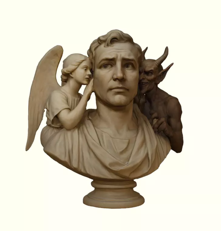 This model depicts a realistic male bust framed by two opposing guides. The central figure is a serious man in classical drapery, with calm yet troubled eyes and a slight tension in the mouth. On his left shoulder, a delicate angel leans in to whisper, with soft features, folded wings, and a gentle hand resting against his neck. On his right side, a horned demon curls around from behind, thin and sinewy, with a sly smile, claws poised and curling near the man’s cloak.
