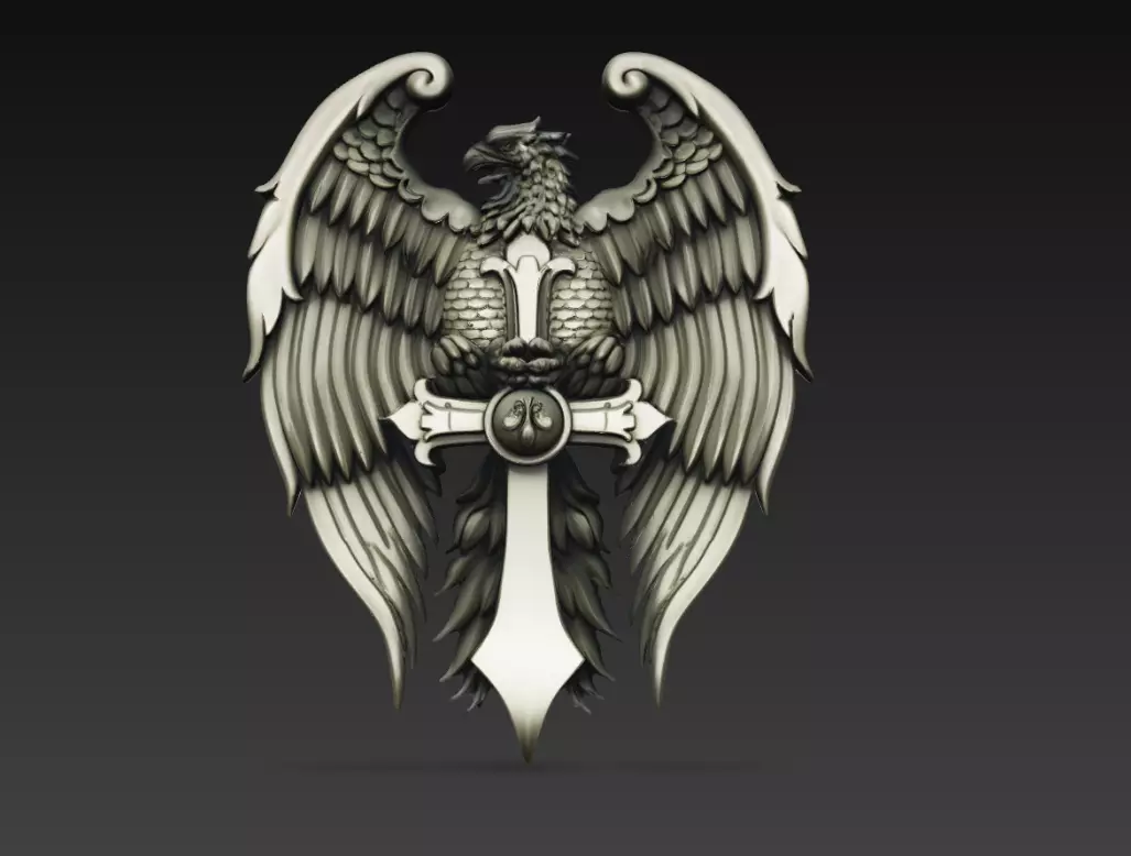 The model presents a majestic eagle with fully extended wings, centered around a strong cross structure. This composition symbolizes strength, protection, faith, and authority, making it both visually striking and meaningful.