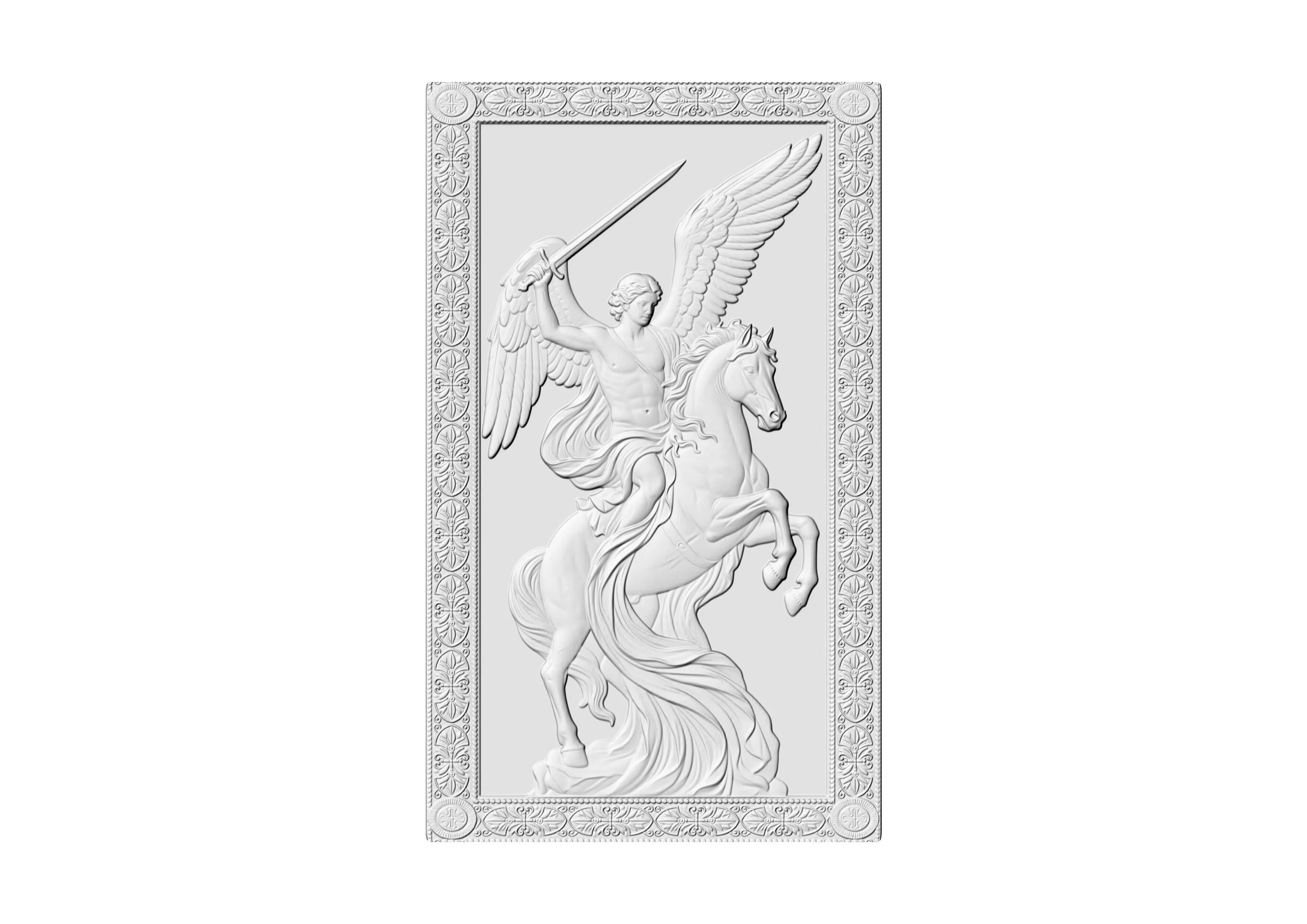 The sculpt emphasizes movement and depth layering—from the flowing drapery and raised sword to the detailed wings and muscular horse—resulting in strong highlights and shadows when carved or printed.