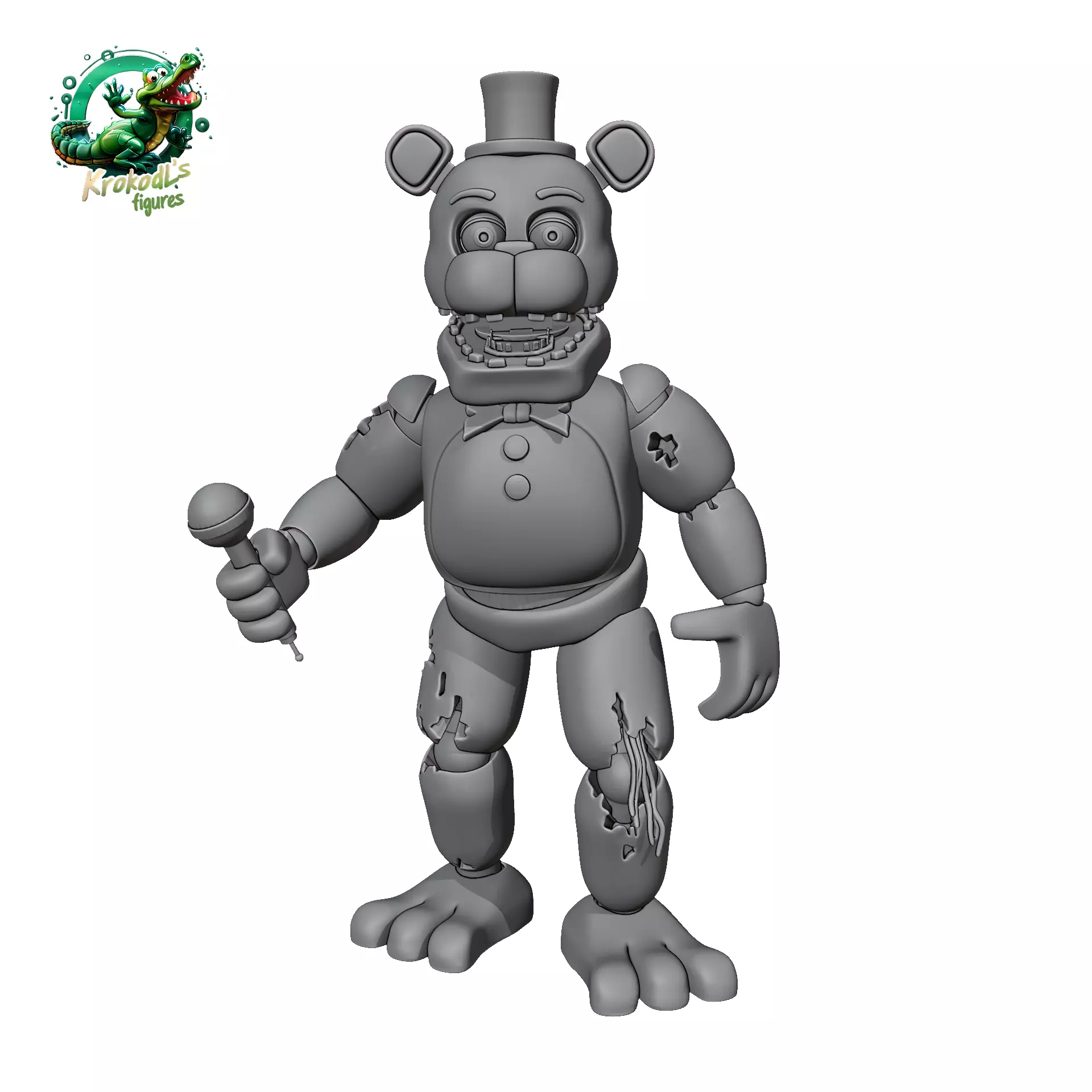 His overall appearance, while recognizable as Freddy, is very different. He is a dirty, dry brown with tan coloring on his muzzle, belly, and in his ears. He has square teeth on his upper and lower jaw, thin black eyebrows, a black tophat, and two small half-circle ears. He has dull blue eyes and a squarish muzzle. His torso is wide and squarish, with a large round belly protruding. He has a black top hat, with matching buttons and a black bowtie on his chest. He has withering along his arms and where his kneecaps would be, wires pouring out. In comparison to the other Withered Animatronics, he is in relatively good condition.