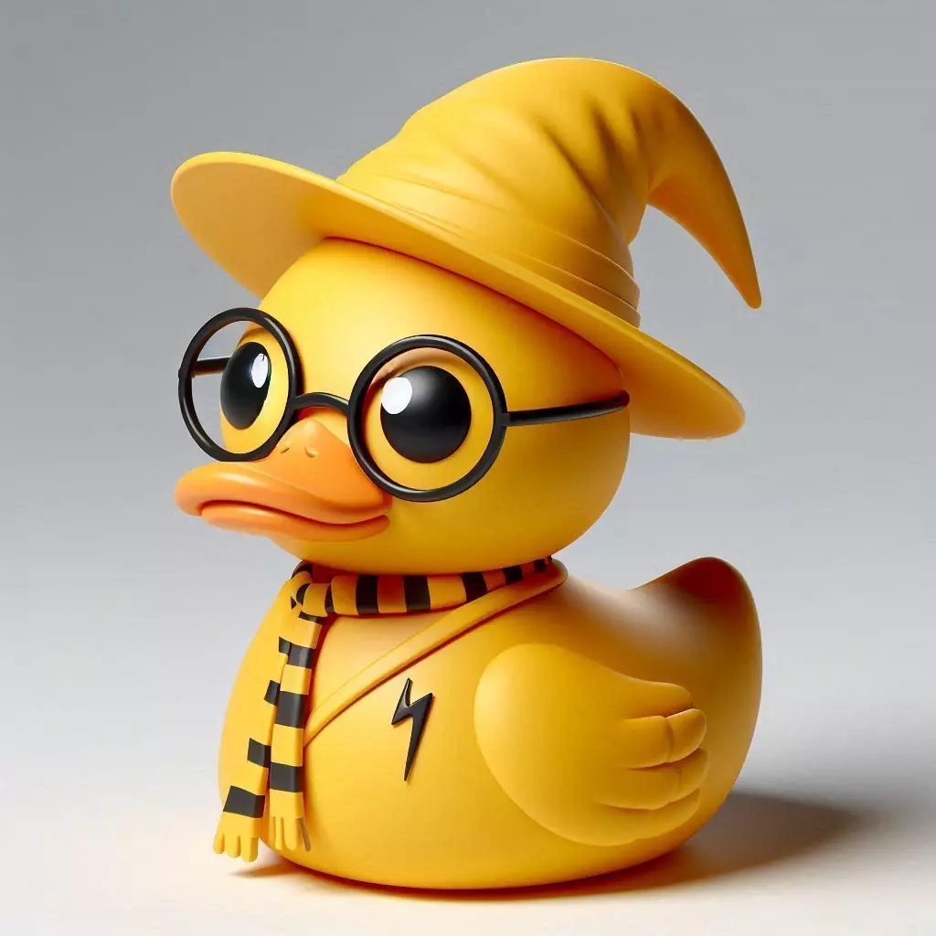 A 3D printable model of a yellow bath duck styled in a wizard theme inspired by Harry Potter. The duck keeps its classic rounded body, short wings, and flat tail, while wearing a small robe simplified for clean geometry and a tiny scarf draped around its neck. Round glasses rest on its face, with a subtle lightning mark etched on the forehead. A small wand is held at one wing to suggest magic. With a cheerful, curious expression and smooth geometry for easy slicing, this sturdy, balanced design is optimized for reliable 3D printing. Perfect as a collectible, funny display piece, or magical desk toy.